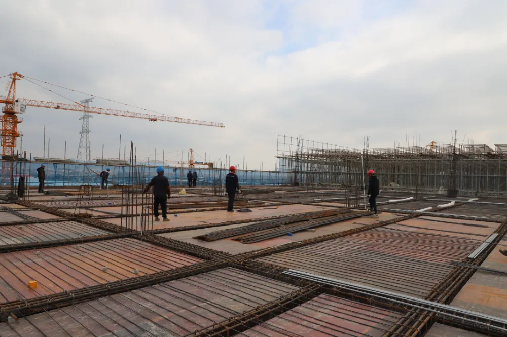 项目施工负责人徐昌明介绍,2号厂房已施工至第7层,室内气体工程已推进至2层,预计下月中旬即可结顶,年底之前进行中间结构验收。1号厂房分4个施工段施工,基础工程基本完成,2层面施工进度达75%,3层面完成25%,计划春节前结构结顶。