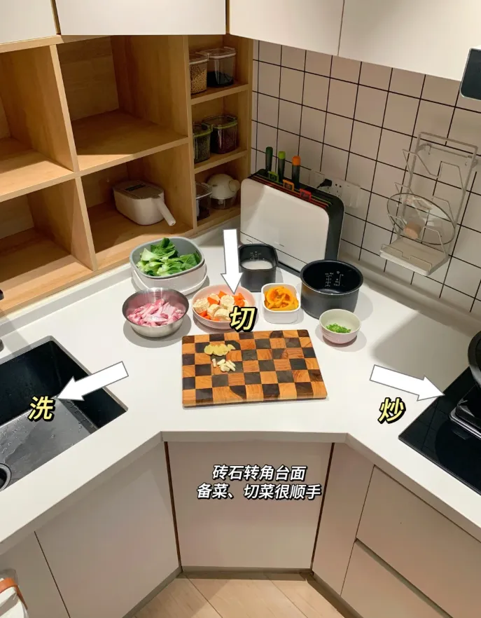 大部分刚需厨房空间都非常小,很多都是仅仅满足洗切炒的基本功能。甚至有的空间更小,满足了洗和炒,压根没有切菜空间,就需要“偷空间”满足基本的切菜功能。