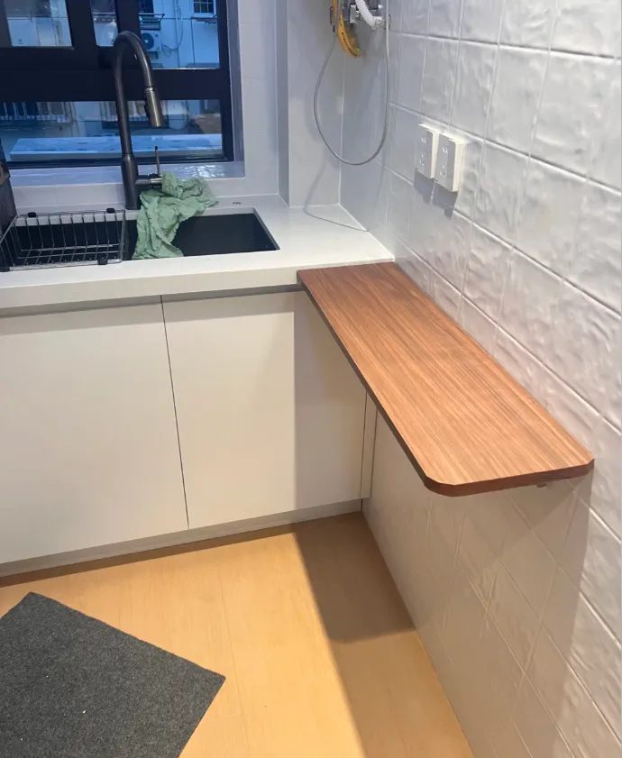 网友@酸酸:空间太小,切菜都没有地方,在网上看到折叠桌,买回来自己安装,轻松解决问题,不用的时候还可以隐藏起来。