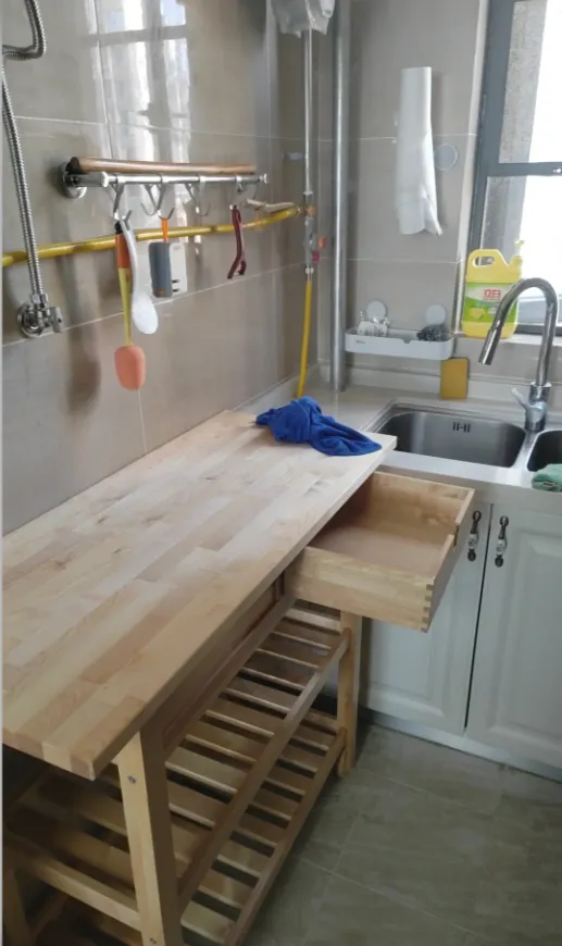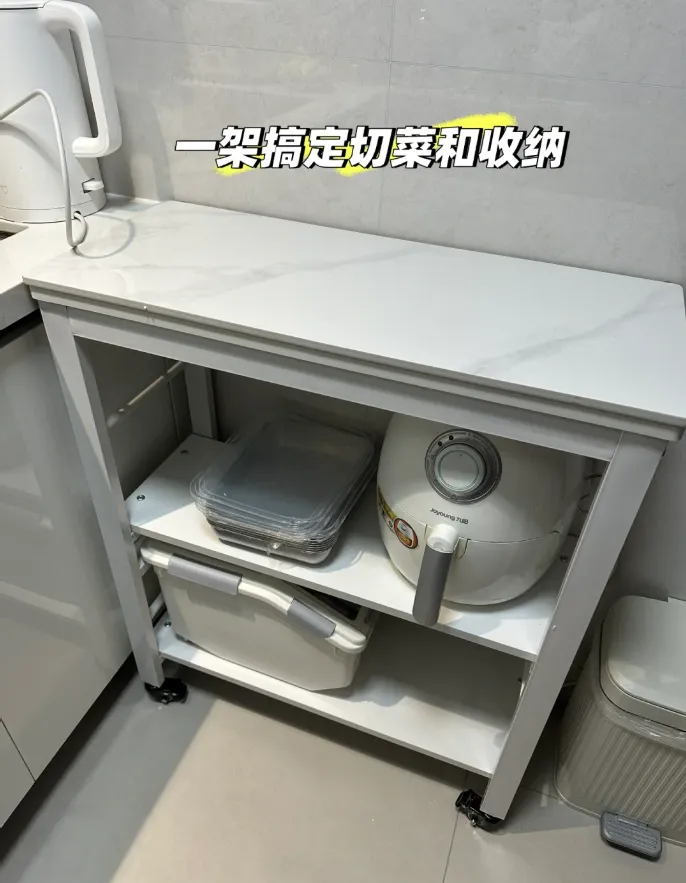 网友@蝌蚪找爸爸:厨房实在太小了,为了满足切菜空间,网购了一个置物架,实现切菜自由,下方还可以收纳储物,为了不遮挡柜门,采用带滑轮的,方便取东西的时候移动。