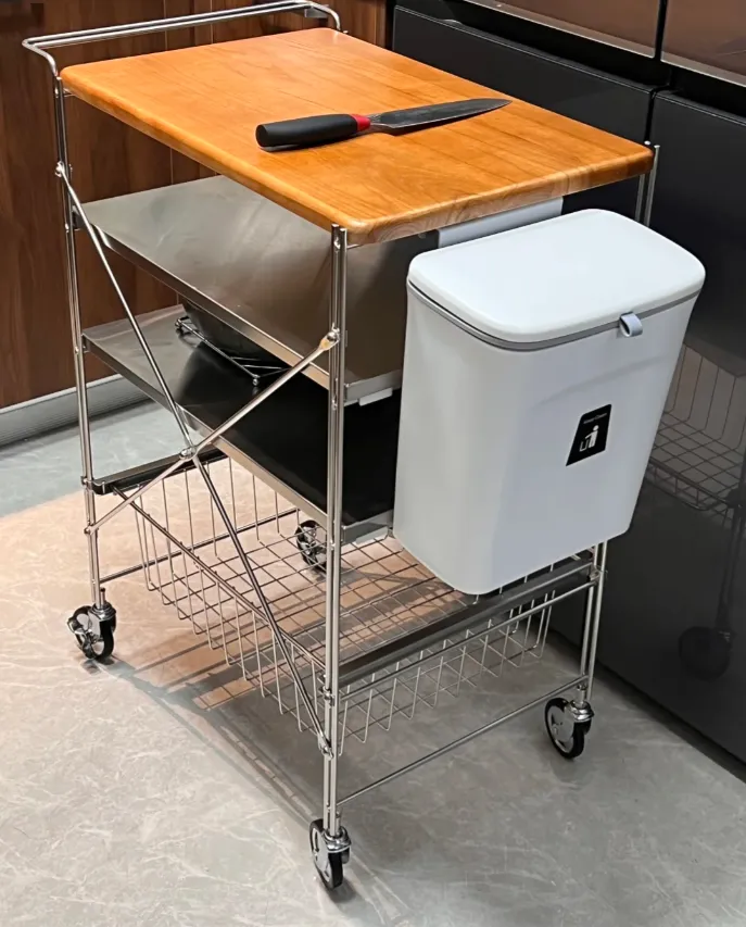 实在没有办法,还可以采用小推车上方放上案板,就可以实现一个临时的切菜区,下方轮子还可以锁住不会移动,不影响物品收纳。