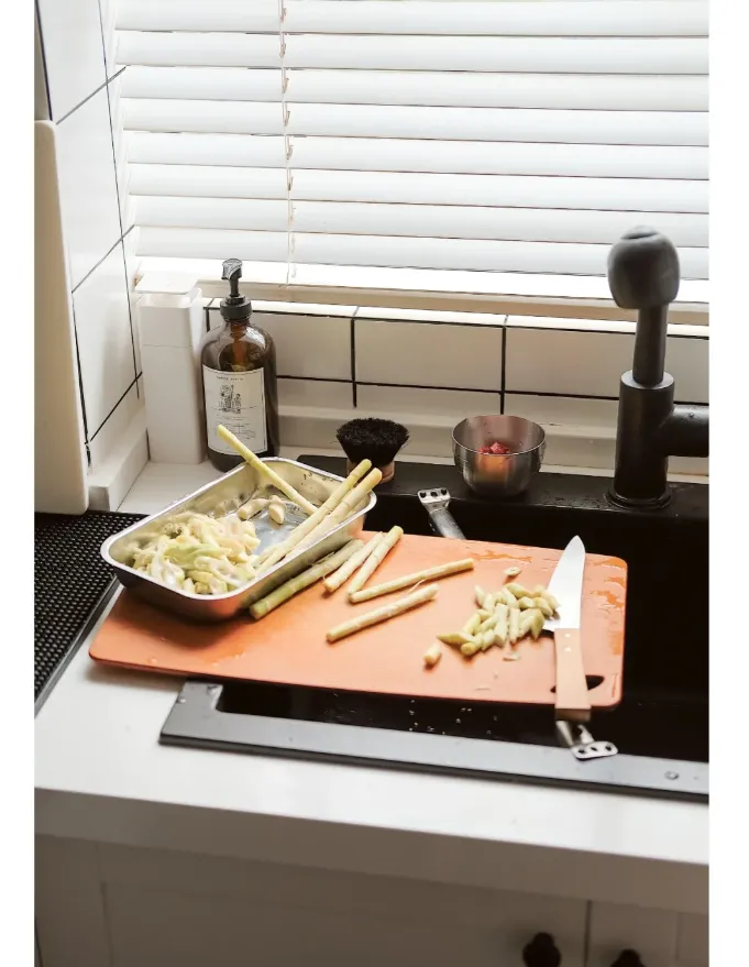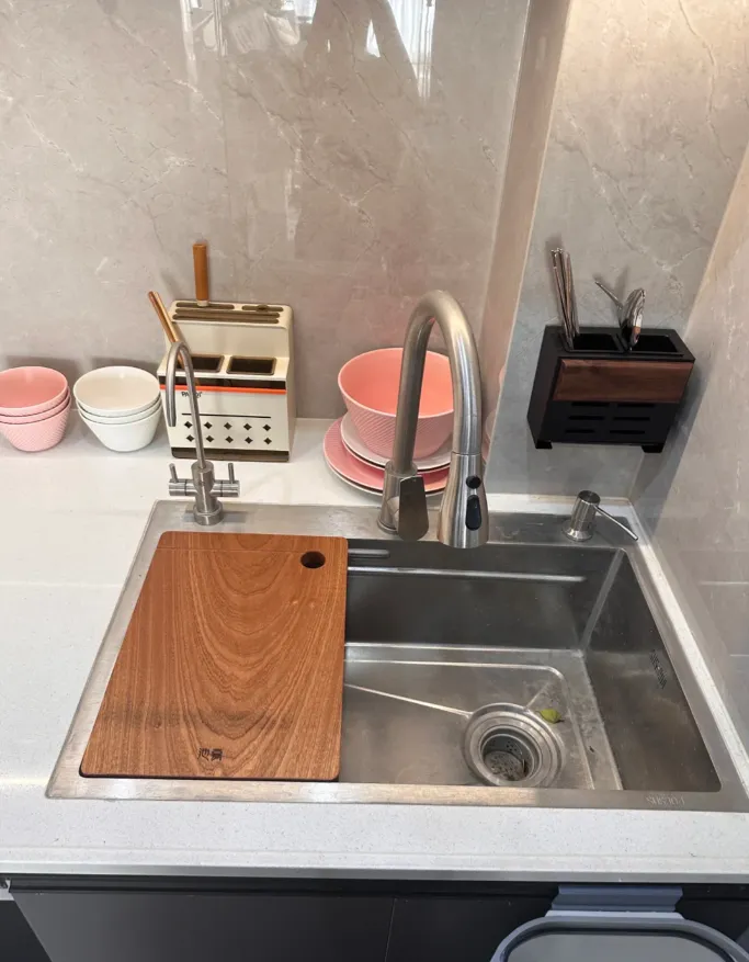 有的水槽自带菜板,台阶式刚好嵌入设计,满足小空间的切菜功能。