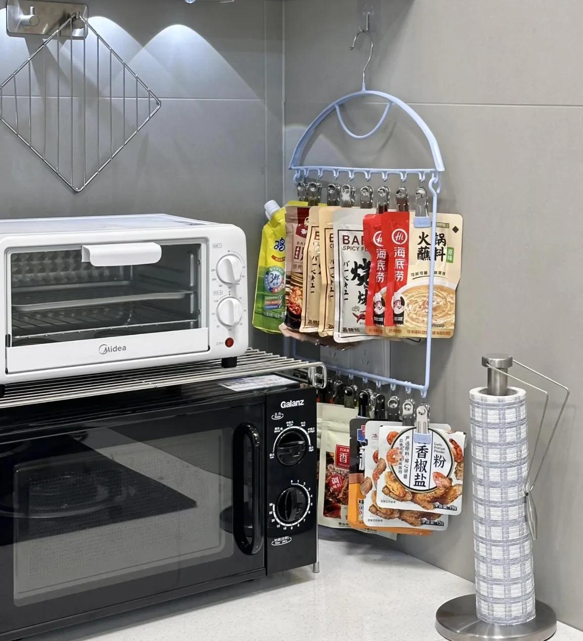 有一天晾衣服的时候看着家里的衣架,突然有了灵感,如果说把衣架稍微改造一下,是不是可以把所有的调料夹好密封挂做一排收纳?不仅不占用厨房空间,拿取调料也再也不会总是碰倒别的调料袋,简直不要太实用!