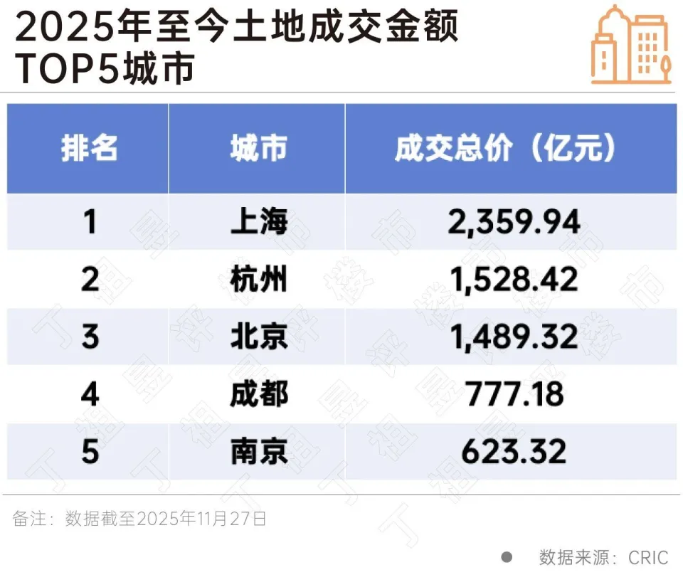 CRIC数据显示,截至2025年11月27日,全国土地成交金额已超2.2万亿元,虽然总成交金额较2024年同期有所下降,但有6个城市成交金额超500亿元,分别为上海、杭州、北京、成都、南京、西安。