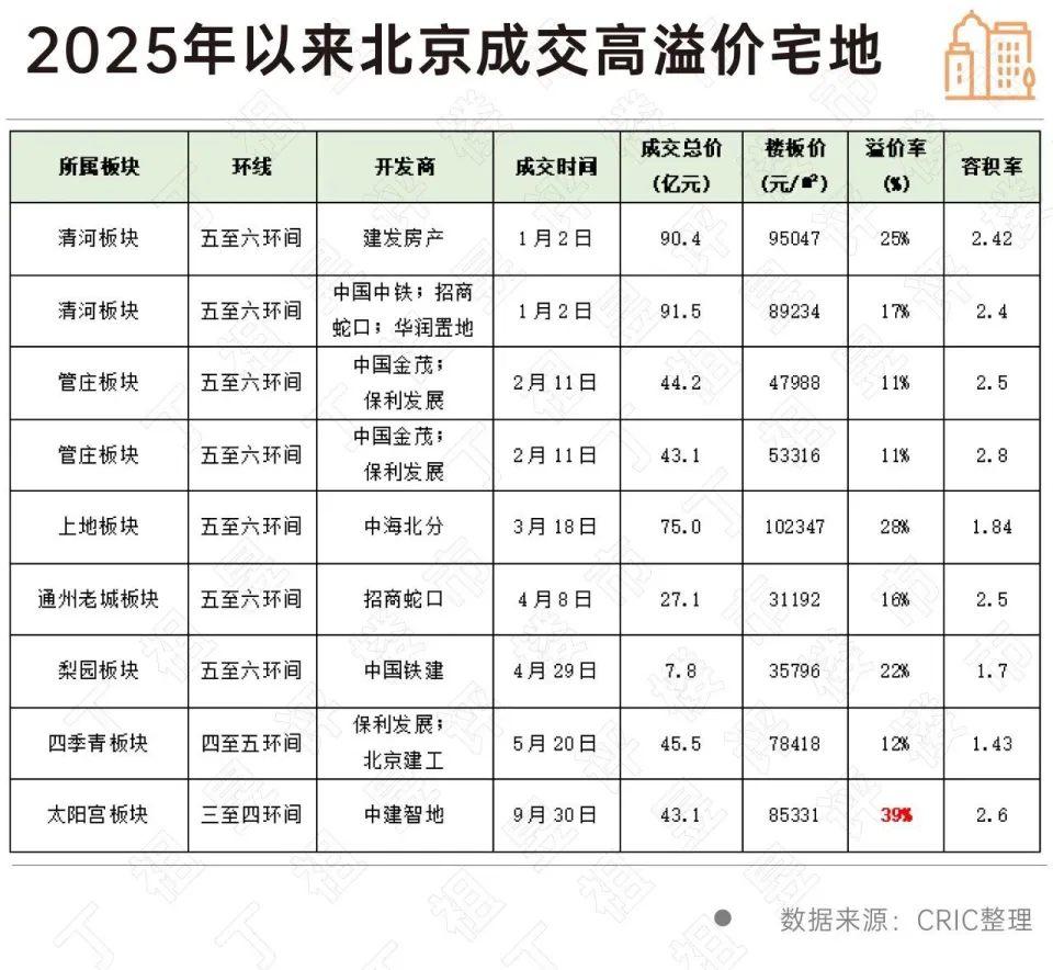 作为行业践行发展新模式的示范城市,北京在2025年推出了大量旧改、城中村改造用地,增加了回龙观、天通苑、朱辛庄等地的有效新增供应,因涉及土地一级开发整备工作,相关地块大多为底价或低溢价成交。但同样的,北京也有大量优质宅地溢价出让,多由大型央国企竞得。