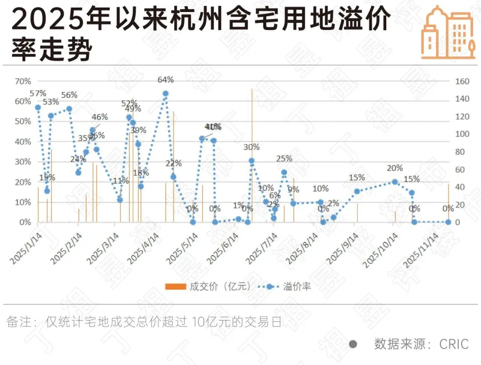 从杭州2025年至今的宅地出让价格与土拍热度两方面可以看到,2025年杭州优质宅地资源主要集中于上半年释放。上半年累计出现20个单日成交总价超10亿元的交易日,而下半年截至目前仅出现7次同类情况。进入下半年后,不仅高总价宅地的出让频次显著下降,土拍市场整体热度亦同步回落。