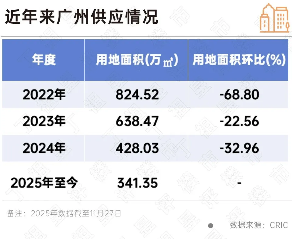 这一方面是受整体市场压力影响,另外一方面也是受供应的限制,CRIC数据显示,2025年至今广州供地面积341.35万平方米,较2024年同期下降近20%,且从2022年至今供应来看,广州已连续多年供应规模大幅下降。