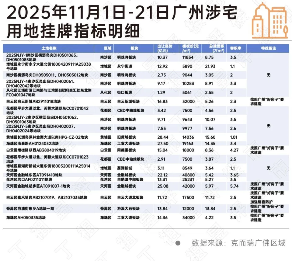 在经过一段时间的休整后,广州土拍市场再次热闹起来,克而瑞数据监测显示,11月截至21日,广州涉宅用地供应20宗,累计起拍总价254.22亿元。
