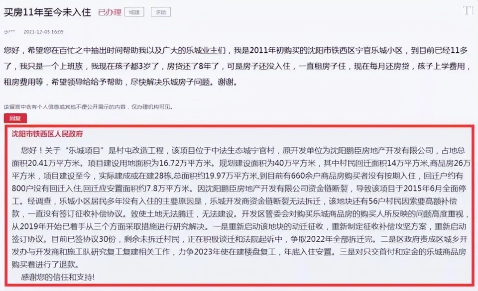 从近年的*留言板我们可以得知,乐城项目一部分已完成了,但存在交房问题,目前也已成立专班进行专项整改解决,目前正在推进中。